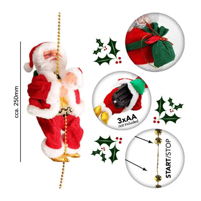 Διακοσμητικός Άη Βασίλης ύψους 25cm που ανεβαίνει και κατεβαίνει σε χρυσή αλυσίδα. Λειτουργεί με 3 μπαταρίες τύπου ΑΑ (δεν περιλαμβάνονται) και διαθέτει κουμπί start/stop για εύκολο έλεγχο. Ιδανικός για χριστουγεννιάτικη διακόσμηση σε δέντρο, βιτρίνα ή σπίτι, προσφέροντας χαρούμενη ατμόσφαιρα και γιορτινή διάθεση.