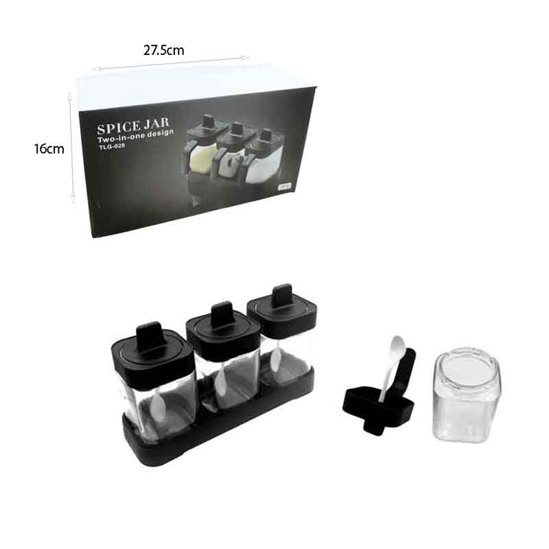 Πρακτικό σετ αποθήκευσης μπαχαρικών με 3 διάφανα δοχεία, καπάκια με λαβή, κουταλάκια και σταθερή βάση. Ιδανικό για καθημερινή χρήση στην κουζίνα για αποθήκευση αλατιού, ζάχαρης, μπαχαρικών ή βοτάνων. Καταλαμβάνει ελάχιστο χώρο και προσφέρει εύκολη πρόσβαση στο περιεχόμενο.