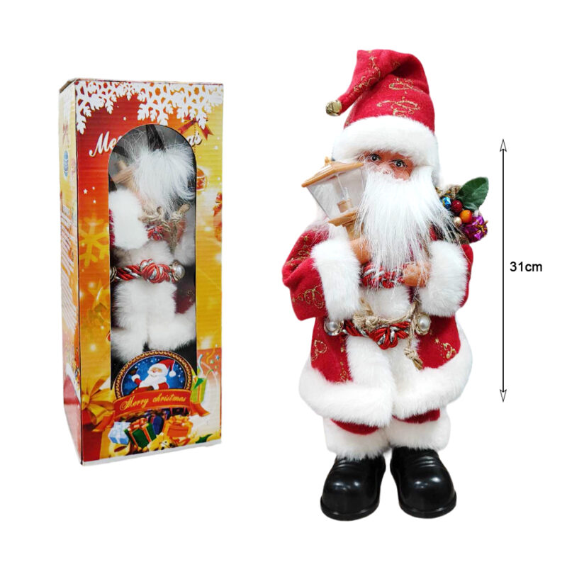 Διακοσμητικός Άη Βασίλης ύψους 31cm, ντυμένος με κλασική κόκκινη στολή με γούνινες λεπτομέρειες. Κρατάει φανάρι στο ένα χέρι και σακούλι με δώρα στον ώμο, χαρίζοντας παραδοσιακή και γιορτινή ατμόσφαιρα στον χώρο σας. Ιδανικός για στολισμό σπιτιού, βιτρίνας ή δώρο σε αγαπημένα πρόσωπα.