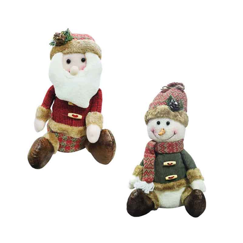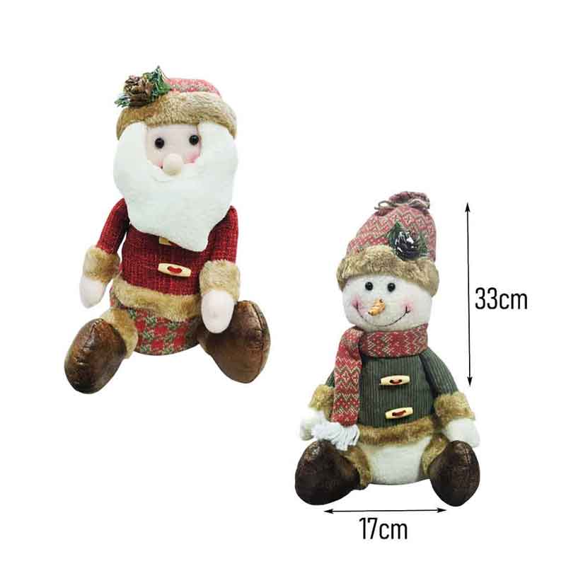 Χειμερινός διακοσμητικός χιονάνθρωπος φτιαγμένος από ύφασμα, ιδανικός για να προσθέσει μια ζεστή και γιορτινή πινελιά στη χριστουγεννιάτικη διακόσμηση του σπιτιού σας. Ντυμένος με πλεκτό πουλόβερ, κασκόλ και σκούφο σε παραδοσιακά χρώματα, αποτελεί μια γλυκιά επιλογή για τραπέζι, ράφι ή βιτρίνα.