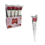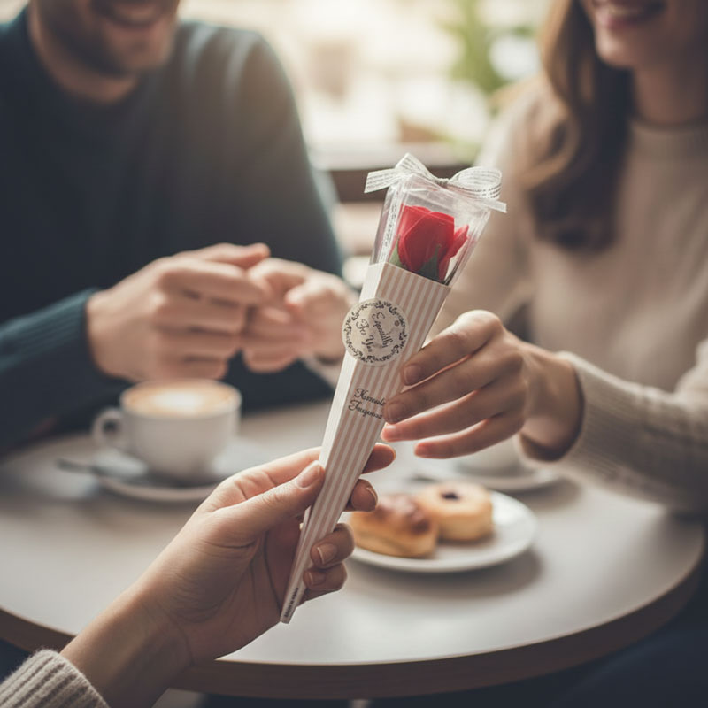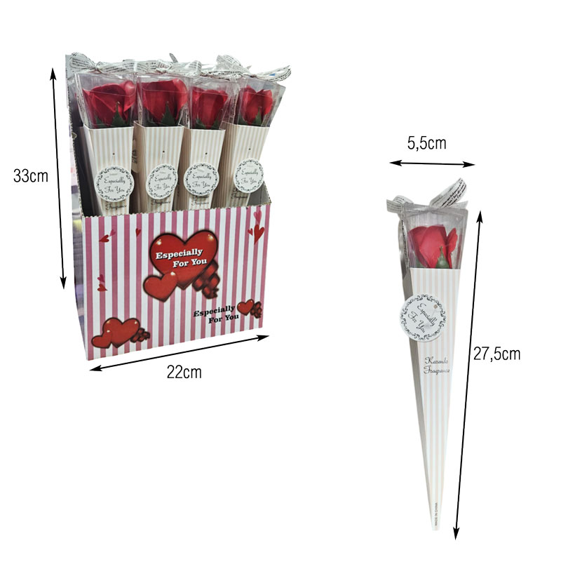Διακοσμητικό τριαντάφυλλο τοποθετημένο σε κομψή χάρτινη συσκευασία σε σχήμα κώνου, ιδανικό για δώρο ή διακόσμηση. Ο προσεγμένος σχεδιασμός με ρομαντικές λεπτομέρειες και η επιγραφή “Especially For You” το καθιστούν κατάλληλο για ιδιαίτερες περιστάσεις όπως γιορτές, επετείους, εκδηλώσεις και δωροεπιλογές βιτρίνας.