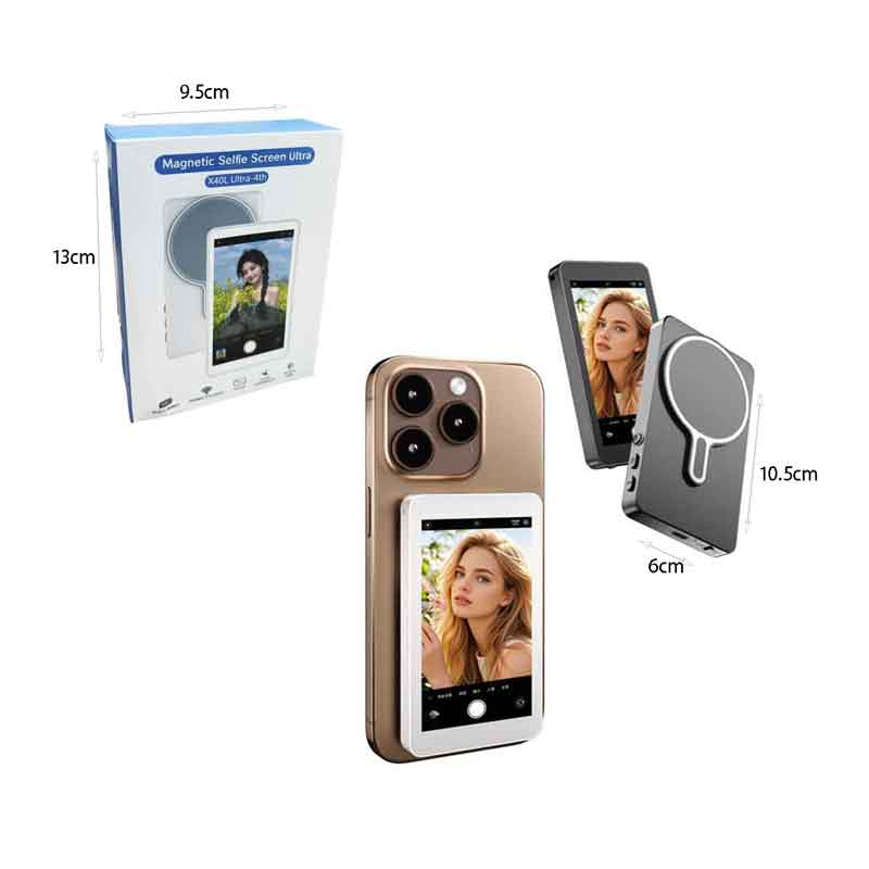 Μαγνητική οθόνη selfie για κινητά τηλέφωνα, ιδανική για λήψη φωτογραφιών και βίντεο με την πίσω κάμερα, προσφέροντας απόλυτο έλεγχο κάδρου και καλύτερη ποιότητα εικόνας. Συνδέεται εύκολα στο πίσω μέρος του κινητού μέσω μαγνητικής βάσης, χωρίς να απαιτείται μόνιμη εγκατάσταση.