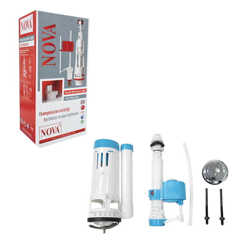 Πλήρες σετ μηχανισμού καζανακίου NOVA, ιδανικό για αντικατάσταση ή αναβάθμιση υπάρχοντος συστήματος. Το σετ περιλαμβάνει μηχανισμό εκκένωσης, φλοτέρ πλήρωσης, σωληνάκι σύνδεσης, μπουτόν διπλής ροής και εξαρτήματα στερέωσης, προσφέροντας ολοκληρωμένη λύση για άμεση και εύκολη εγκατάσταση. Η διπλή επιλογή ροής συμβάλλει στην εξοικονόμηση νερού και στη βελτιστοποίηση της κατανάλωσης.