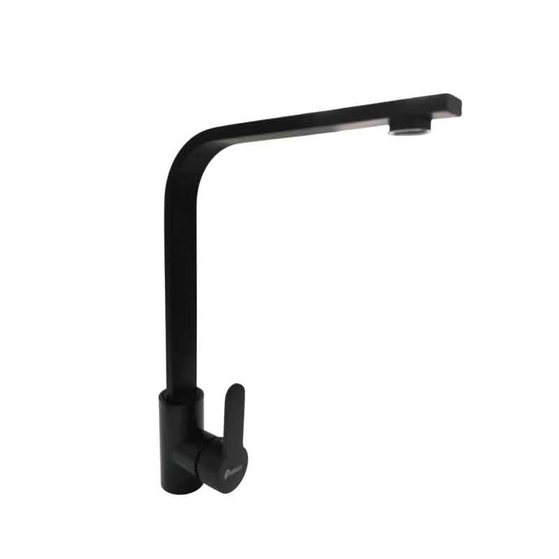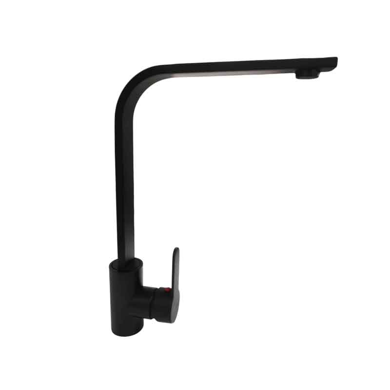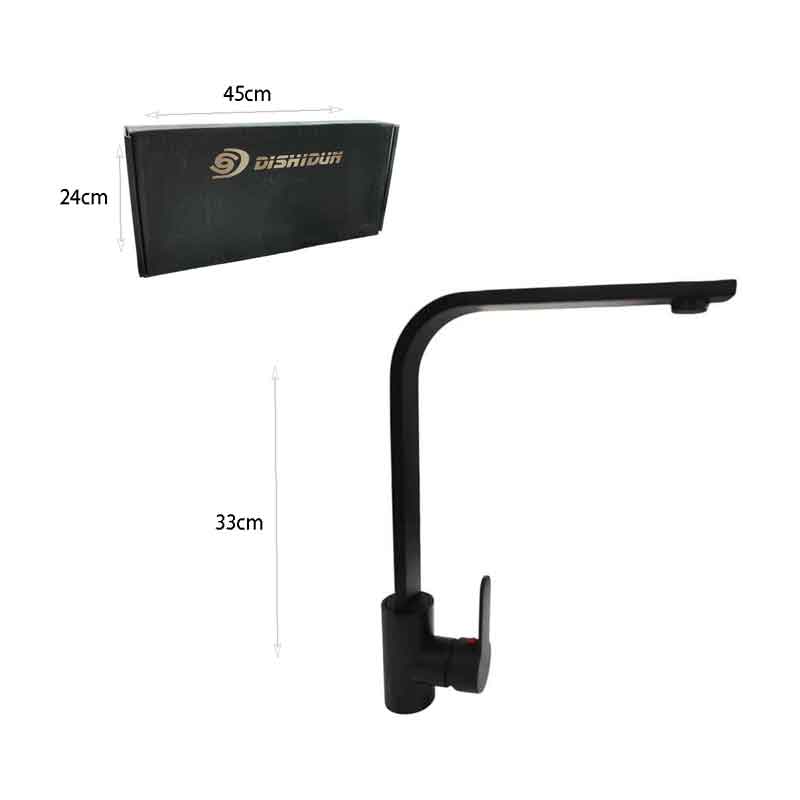 Μοντέρνα μπαταρία νεροχύτη DISHIDUN σε μαύρο ματ χρώμα με μίκτη, ιδανική για κουζίνες που συνδυάζουν στυλ και λειτουργικότητα. Διαθέτει υψηλό καμπύλο στόμιο ύψους 33 cm, που προσφέρει άνεση στη χρήση και ευκολία στο πλύσιμο μεγάλων σκευών.