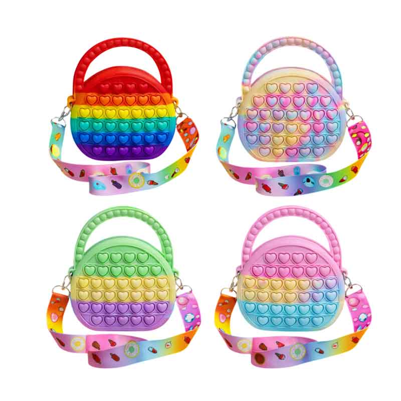 Παιδική τσάντα ώμου Pop It με ανάγλυφες καρδιές, σχεδιασμένη για να συνδυάζει παιχνίδι και καθημερινή χρήση. Διαθέτει ενσωματωμένες φυσαλίδες Pop It που προσφέρουν διασκεδαστική απασχόληση, ενώ παράλληλα λειτουργεί ως πρακτική τσάντα για μικροαντικείμενα.