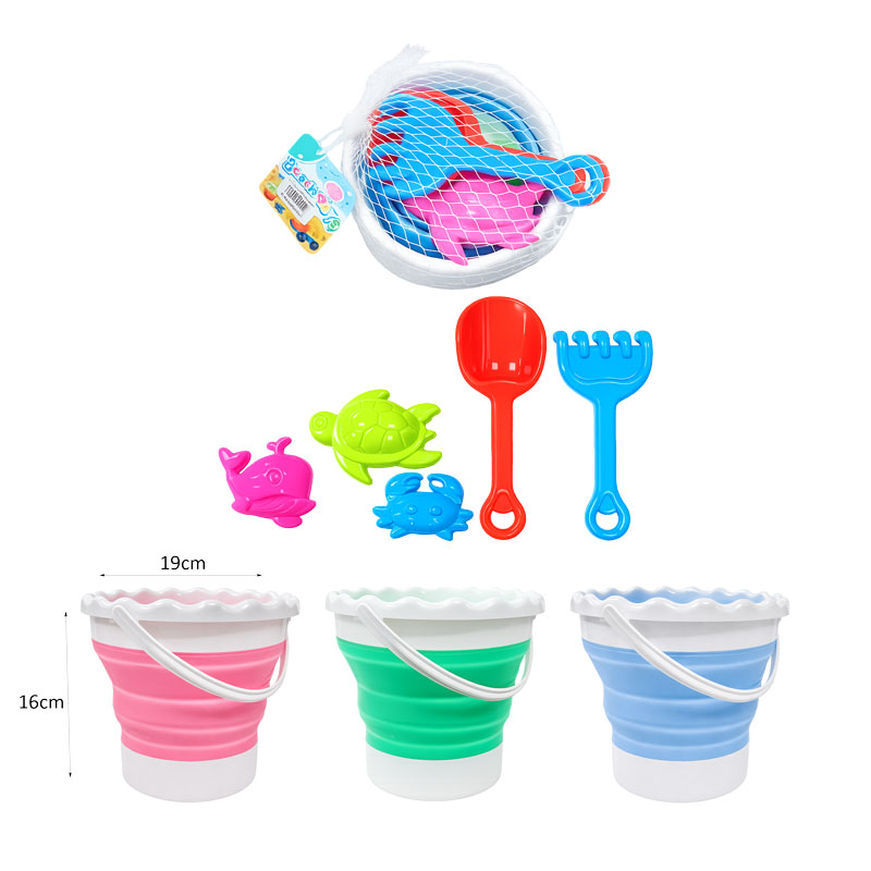 Ολοκληρωμένο παιδικό σετ παραλίας που περιλαμβάνει πτυσσόμενο κουβαδάκι και διάφορα αξεσουάρ όπως φτυαράκι, τσουγκράνα και καλούπια, ιδανικά για ατελείωτο παιχνίδι στην άμμο. Το κουβαδάκι είναι ελαφρύ και πρακτικό, με πτυσσόμενο σχεδιασμό για εύκολη μεταφορά και αποθήκευση.
