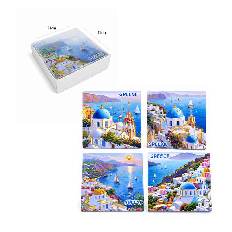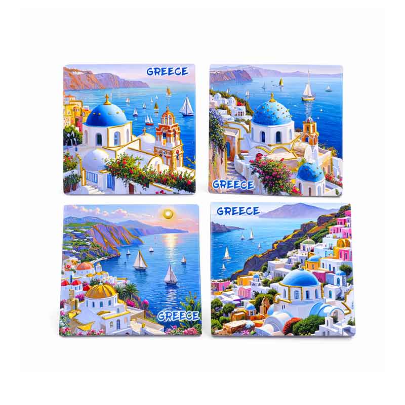 Σετ τεσσάρων σουβέρ με εντυπωσιακές απεικονίσεις τοπίων εμπνευσμένων από τη Σαντορίνη και το ελληνικό νησιωτικό τοπίο. Τα σχέδια απεικονίζουν χαρακτηριστικούς λευκούς οικισμούς με γαλάζιους τρούλους, θάλασσα και ιστιοπλοϊκά, αποτυπώνοντας την ομορφιά του Αιγαίου.