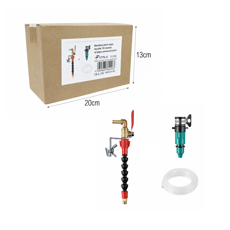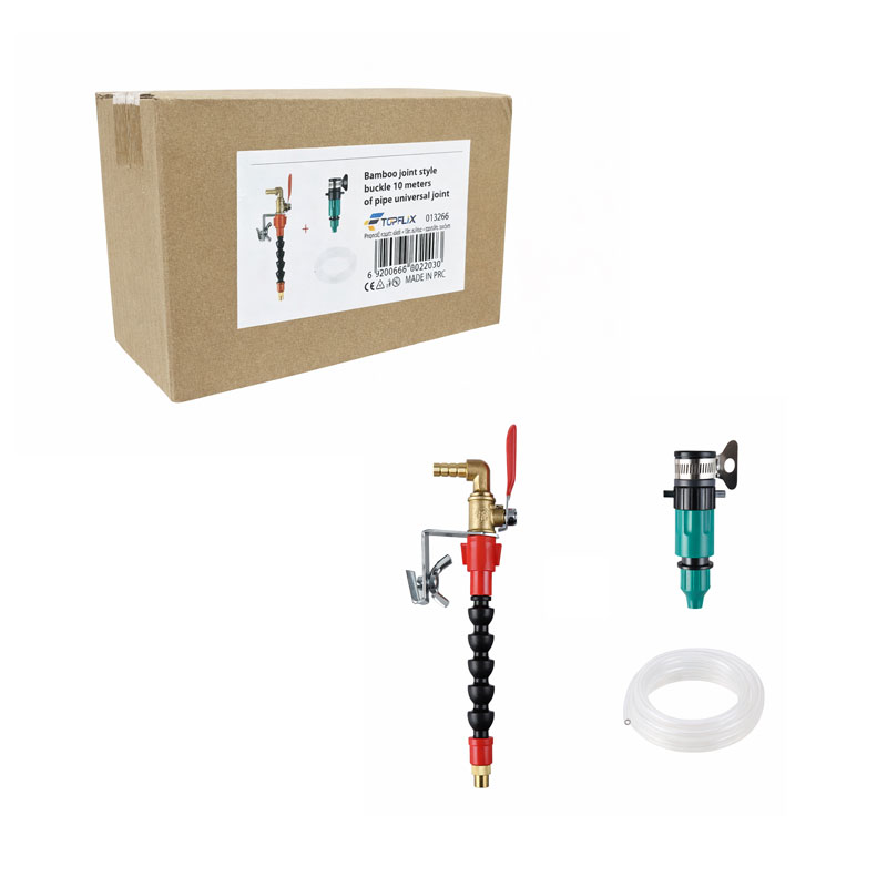 Πλήρες σετ συστήματος άρδευσης με την ονομασία Bamboo Joint Style Buckle, συνολικού μήκους 10 μέτρων, σχεδιασμένο για αποτελεσματικό και ελεγχόμενο πότισμα. Το σετ περιλαμβάνει εύκαμπτο σωλήνα τύπου αρθρωτού συνδέσμου (universal joint), που επιτρέπει την εύκολη κατεύθυνση του νερού με ακρίβεια, ακόμα και σε δύσκολα σημεία.
