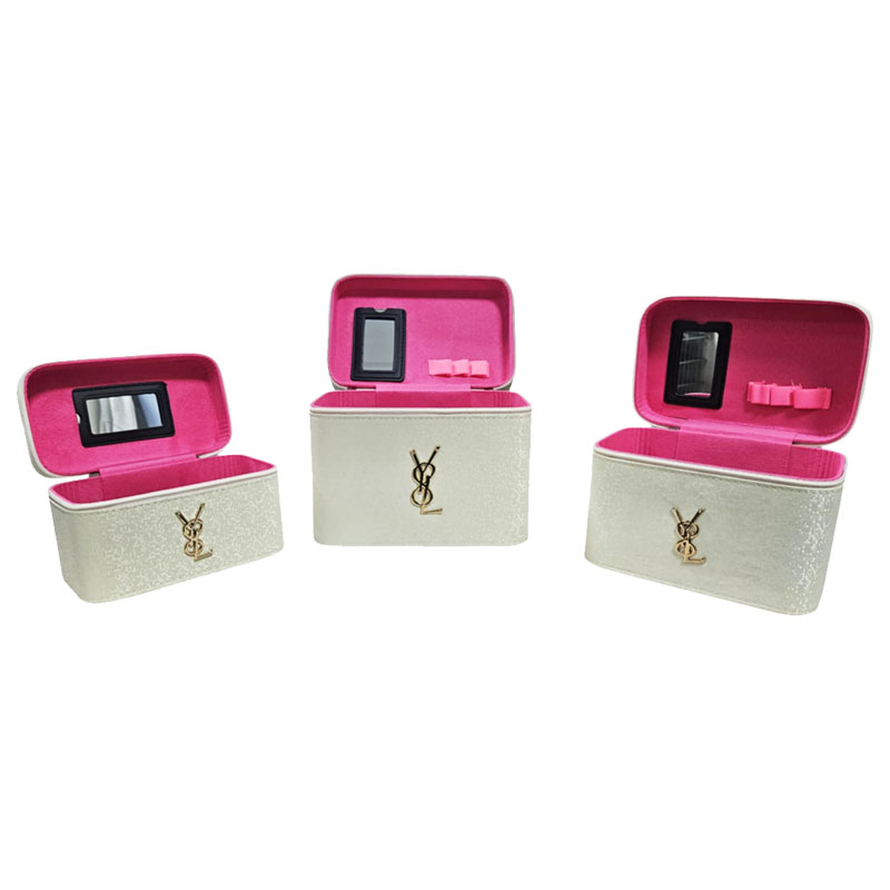 Κάθε βαλιτσάκι διαθέτει εσωτερική επένδυση, ενσωματωμένο καθρέφτη και ασφαλές κλείσιμο με φερμουάρ, προσφέροντας άνεση και λειτουργικότητα. Η εξωτερική γυαλιστερή υφή προσδίδει μοντέρνα και πολυτελή εμφάνιση, ενώ το χερούλι μεταφοράς διευκολύνει τη χρήση.