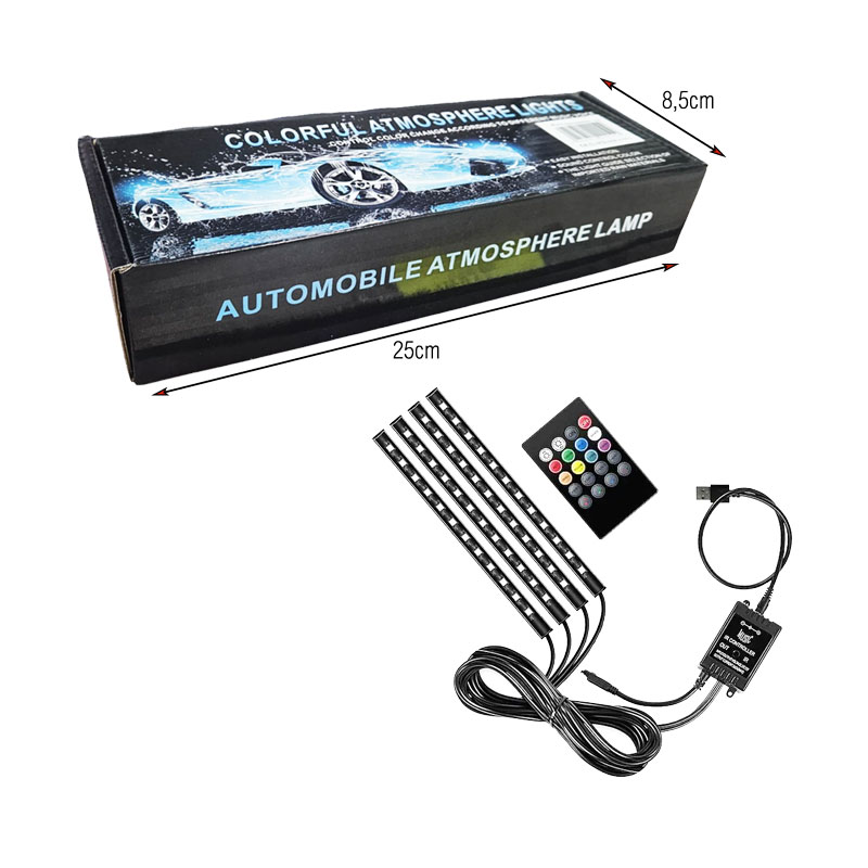 Δώστε στυλ και ατμόσφαιρα στο εσωτερικό του αυτοκινήτου σας με το σετ LED φωτισμού αυτοκινήτου με τηλεχειριστήριο. Διαθέτει 4 πλαστικές LED λωρίδες μήκους 23 cm, με συνολικά 36 LED λαμπάκια, που μπορούν να τοποθετηθούν διακριτικά κάτω από τα καθίσματα, στη κονσόλα, στο ντουλαπάκι, στα πίσω καθίσματα ή στο πορτμπαγκάζ.
