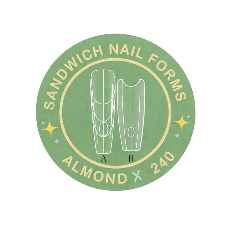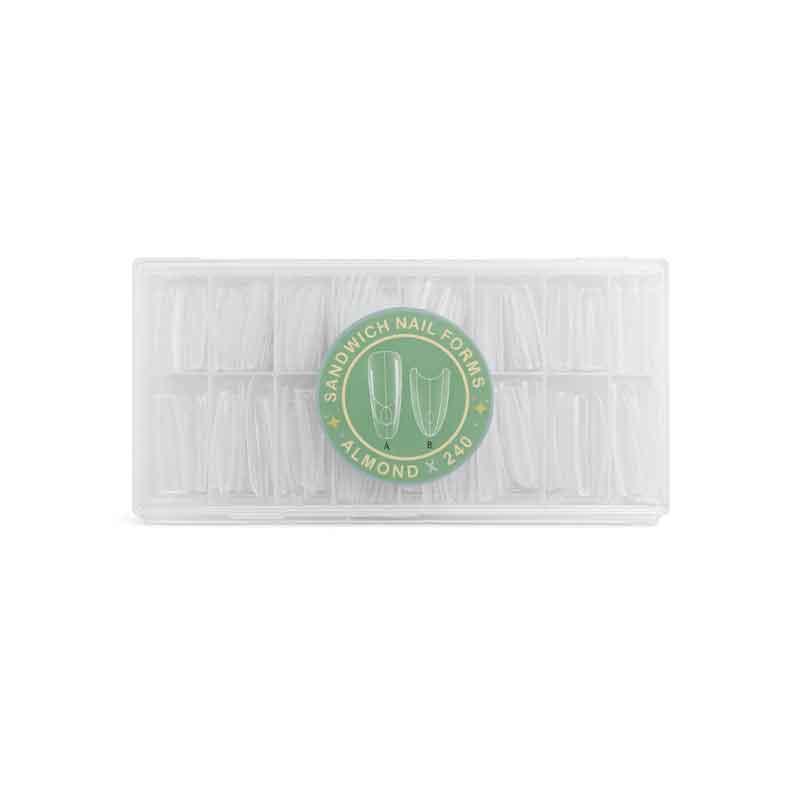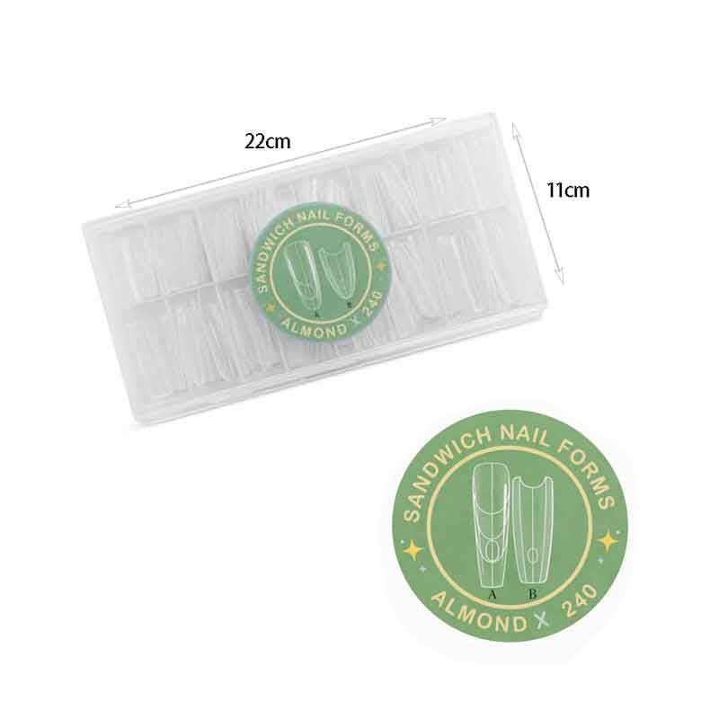 Επαγγελματικές φόρμες νυχιών τύπου Sandwich σε σχήμα Almond, ιδανικές για επιμήκυνση με gel, polygel ή ακρυλικό. Το σετ περιλαμβάνει 240 τεμάχια σε πρακτικό διάφανο κουτί αποθήκευσης για εύκολη οργάνωση και επιλογή μεγέθους.