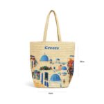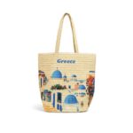 Τσάντα Θαλάσσης Ψάθινη με Σχέδιο Ελληνικού Νησιού – Straw Beach Bag Greek Island Print