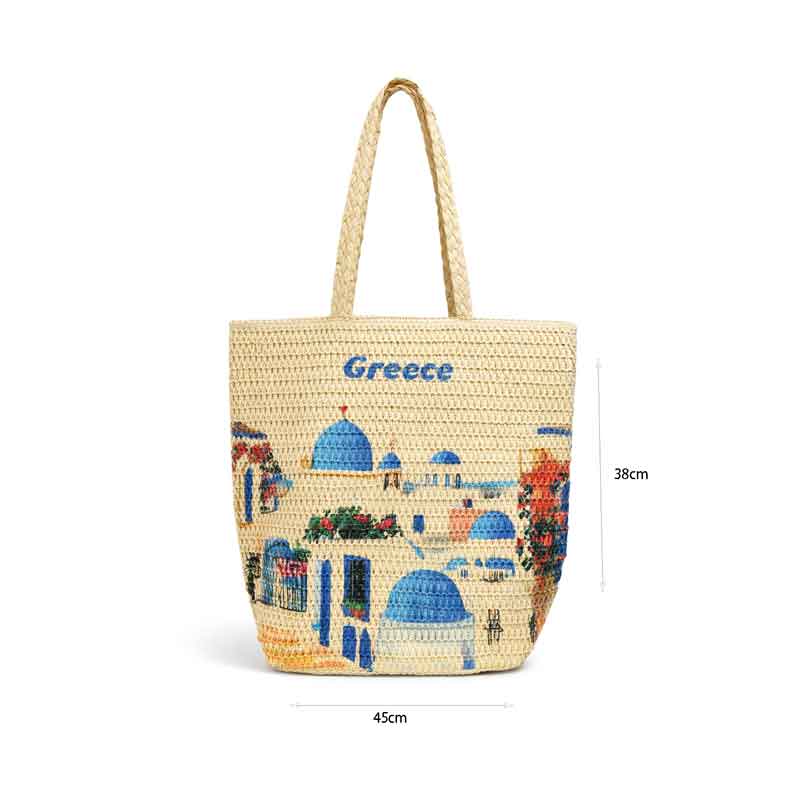 Ψάθινη τσάντα θαλάσσης με εντυπωσιακό σχέδιο εμπνευσμένο από ελληνικό νησί, που αποτυπώνει την καλοκαιρινή ατμόσφαιρα με χαρακτηριστικούς τρούλους και παραδοσιακά σπίτια. Ευρύχωρη και πρακτική, είναι ιδανική για την παραλία, τις διακοπές ή τις καθημερινές σας εξορμήσεις. Διαθέτει ανθεκτικά χερούλια για άνετη μεταφορά και ελαφριά κατασκευή που διευκολύνει τη χρήση. Συνδυάζει λειτουργικότητα και στυλ, αποτελώντας μια ξεχωριστή επιλογή για το καλοκαίρι.