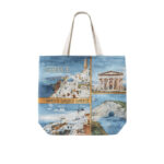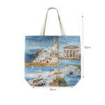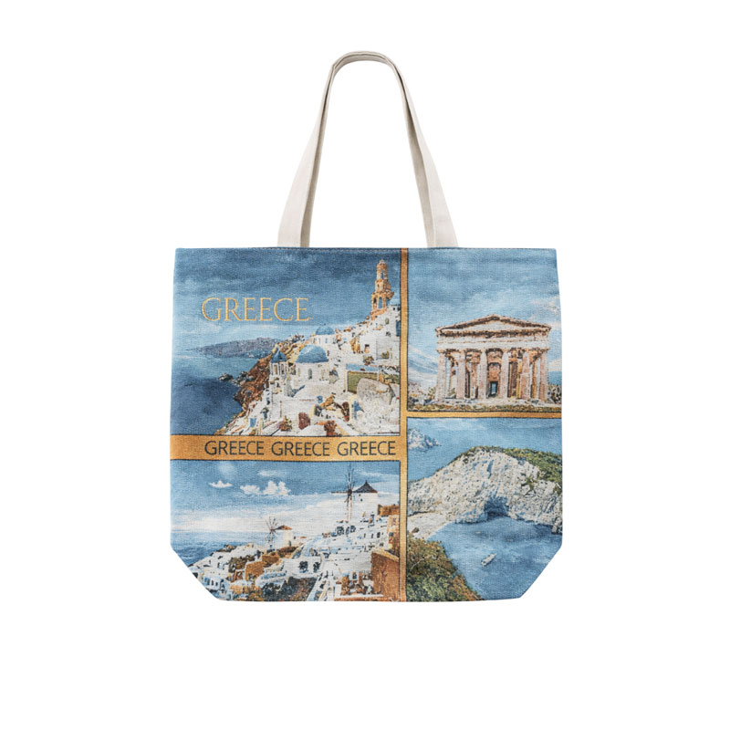 Εντυπωσιακή υφασμάτινη τσάντα θαλάσσης με καλλιτεχνική απεικόνιση εμβληματικών τοπίων και αξιοθέατων της Ελλάδας. Το σχέδιο περιλαμβάνει χαρακτηριστικές εικόνες όπως νησιωτικό τοπίο με λευκά σπίτια και μπλε τρούλους, αρχαίο ναό και εντυπωσιακή παραλία με γαλαζοπράσινα νερά, δημιουργώντας μία αυθεντική ελληνική καλοκαιρινή σύνθεση.