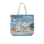 Εντυπωσιακή υφασμάτινη τσάντα θαλάσσης με καλοκαιρινό σχέδιο Paralia, εμπνευσμένο από ελληνικό παραθαλάσσιο τοπίο. Η μπροστινή όψη απεικονίζει εκκλησία δίπλα στη θάλασσα, με γαλάζιο ουρανό και φυσικό τοπίο, δημιουργώντας μια αυθεντική ελληνική καλοκαιρινή αίσθηση.
