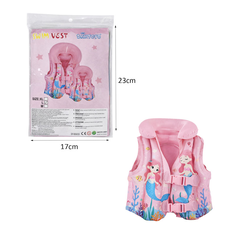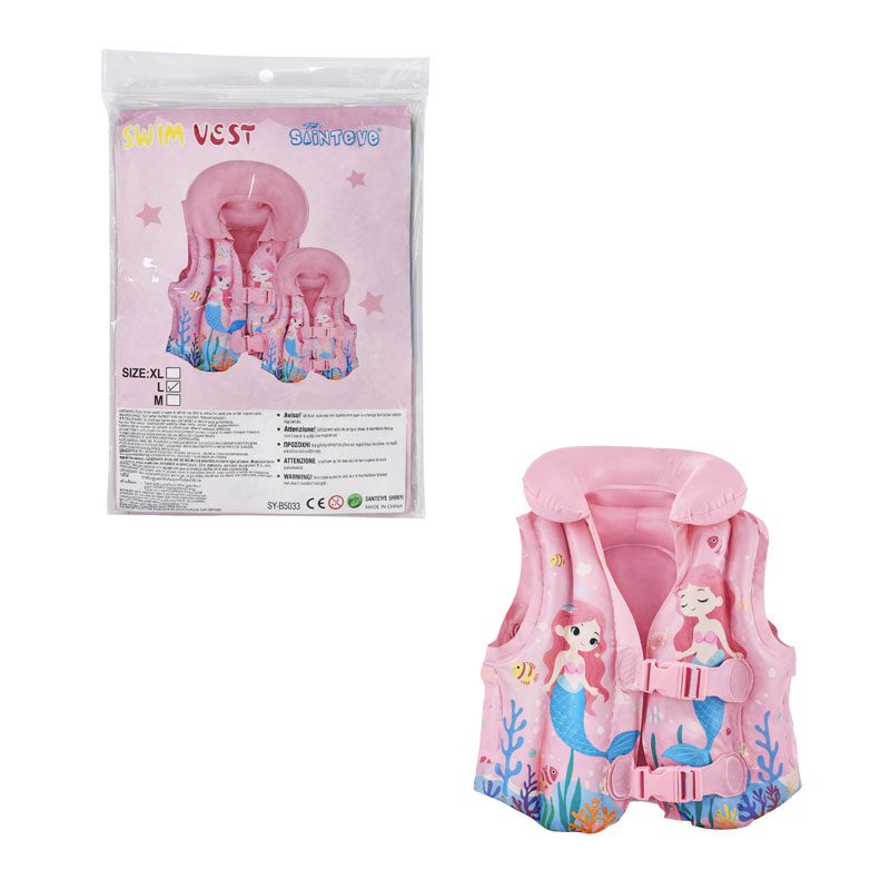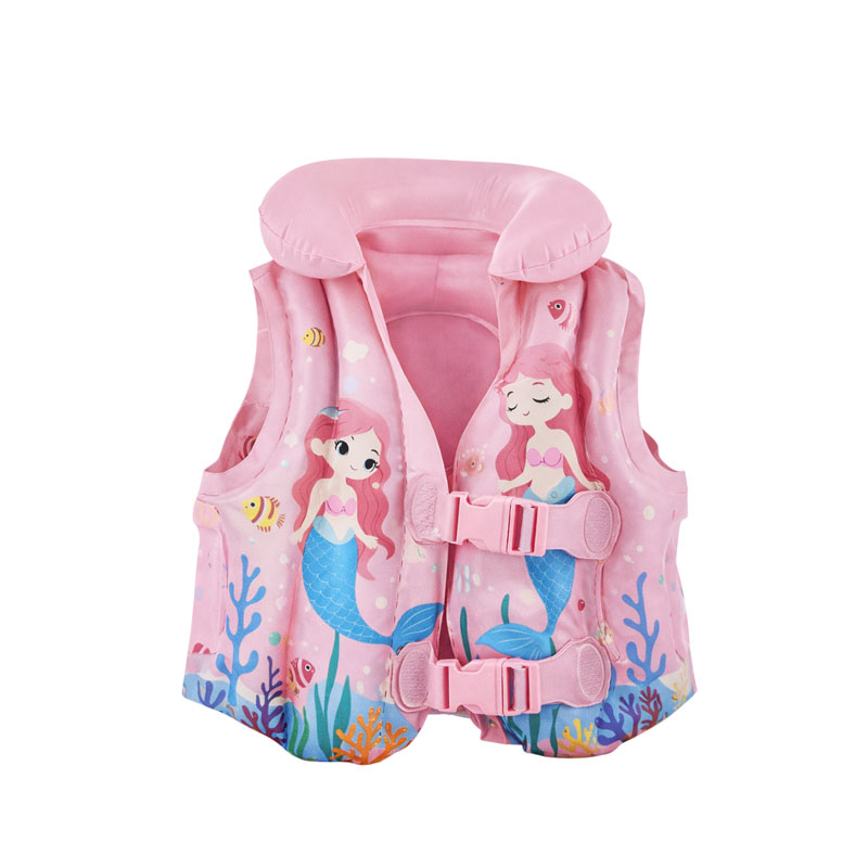 Φουσκωτό παιδικό γιλέκο θαλάσσης σε ροζ απόχρωση με χαρούμενο σχέδιο γοργόνας και θαλάσσιων στοιχείων, ιδανικό για τις καλοκαιρινές δραστηριότητες σε θάλασσα και πισίνα. Προσφέρει επιπλέον πλευστότητα και βοηθά το παιδί να εξοικειωθεί με το νερό με μεγαλύτερη άνεση.