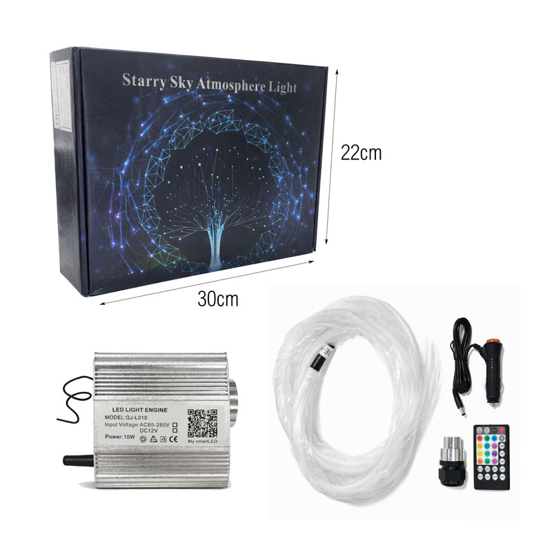 Το σετ περιλαμβάνει LED light engine ισχύος 10W, δεσμίδα οπτικών ινών, τηλεχειριστήριο πολλαπλών χρωμάτων και εφέ, καθώς και καλώδιο τροφοδοσίας αυτοκινήτου. Υποστηρίζει λειτουργία αλλαγής χρωμάτων και φωτιστικών προγραμμάτων για να προσαρμόζεται στη διάθεση και τον χώρο σας.