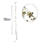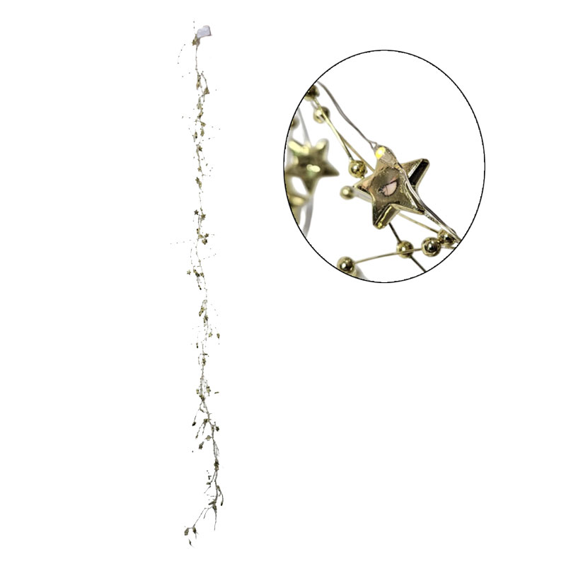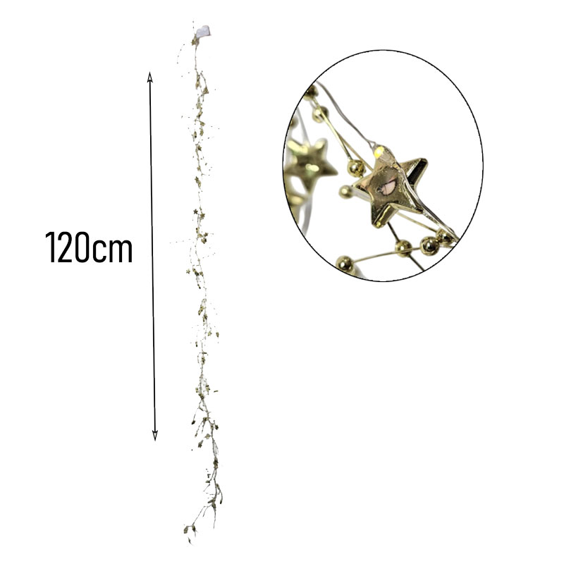 Εντυπωσιακή χριστουγεννιάτικη φωτιζόμενη γιρλάντα με χρυσά αστέρια και πέρλες. Διαθέτει ενσωματωμένα λαμπάκια που δημιουργούν μια ζεστή, γιορτινή ατμόσφαιρα και χαρίζουν λάμψη σε κάθε σημείο του σπιτιού. Ιδανική για στολισμό δέντρου, τζακιού, τραπεζιού ή καθρέφτη.