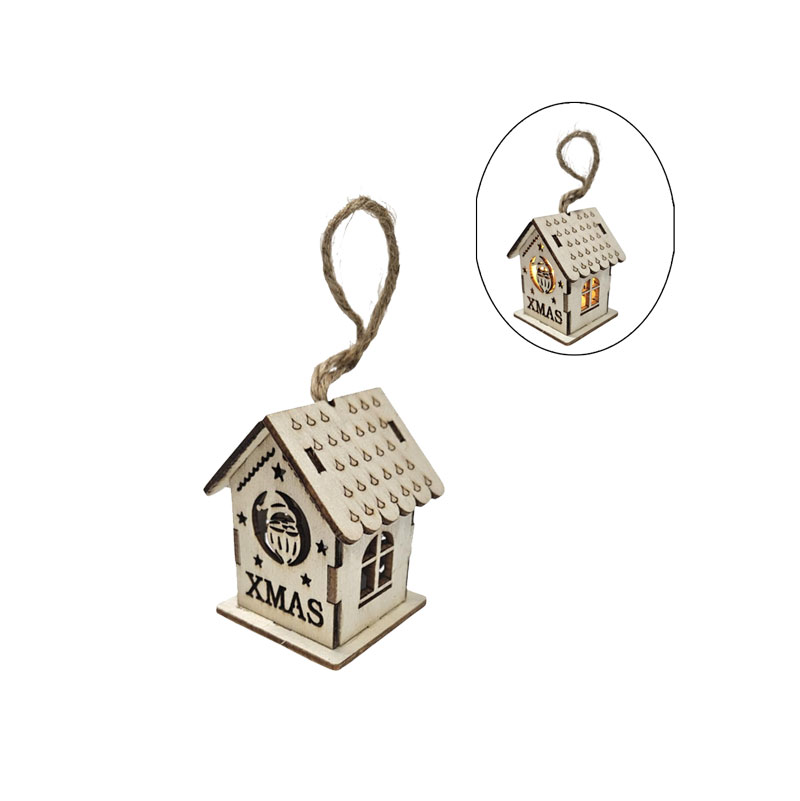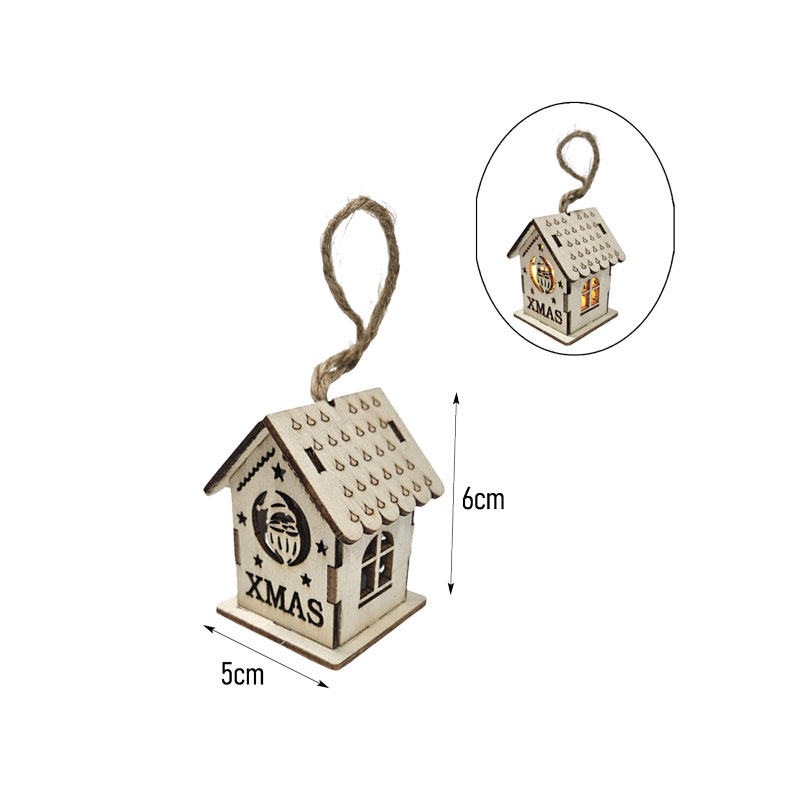 Ξύλινο χριστουγεννιάτικο σπιτάκι με κρεμαστό κορδόνι και εσωτερικό φωτισμό LED. Κατασκευασμένο με λεπτομέρειες κοπής που αναδεικνύουν τα χριστουγεννιάτικα σχέδια όταν φωτίζεται, δημιουργώντας μια ζεστή γιορτινή ατμόσφαιρα. Ιδανικό για το δέντρο ή για να διακοσμήσει μικρές γωνιές του σπιτιού. Διαστάσεις 6x5cm.