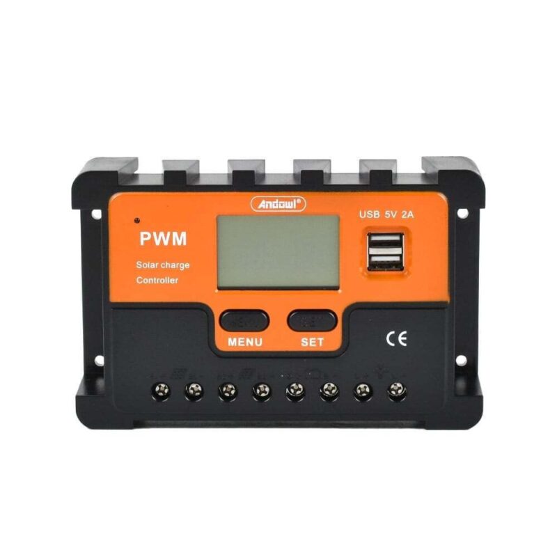 Ρυθμιστής φόρτισης της εταιρίας Andowl κατάλληλος για εγκαταστάσεις μέχρι 65A στα 24V. Πρόκειται για τύπο PWM. Οι Ρυθμιστές φόρτισης PWM συνδέουν απλά το Φωτοβολταϊκό πάνελ με τη μπαταρία (12/24/48V) καθιστώντας τους απλούς διακόπτες. Όταν ο διακόπτης κλείνει, η τάση του πάνελ εξισώνεται με αυτή της μπαταρίας. Το αποτέλεσμα είναι η τάση της συστοιχίας που μπορεί να δεχθεί ο PWM ρυθμιστής να εξαρτάται από την τάση της μπαταρίας και είναι μικρή, συνήθως ένα με δύο πάνελ των 100/200Wp σε σειρά και με αντίστοιχα μικρό ρεύμα φόρτισης σε σχέση με τις δυνατότητες ενός MPPT ρυθμιστή φόρτισης. Με βάση τα παραπάνω, οι PWM ρυθμιστές φόρτισης είναι ιδανικοί για μικρότερα συστήματα όπου η αποδοτικότητα του συστήματος δεν είναι τόσο σημαντικός παράγοντας και για ηλιακούς συλλέκτες με μέγιστη τάση ισχύος (Vmp) έως 18V για φόρτιση μπαταρίας 12V.