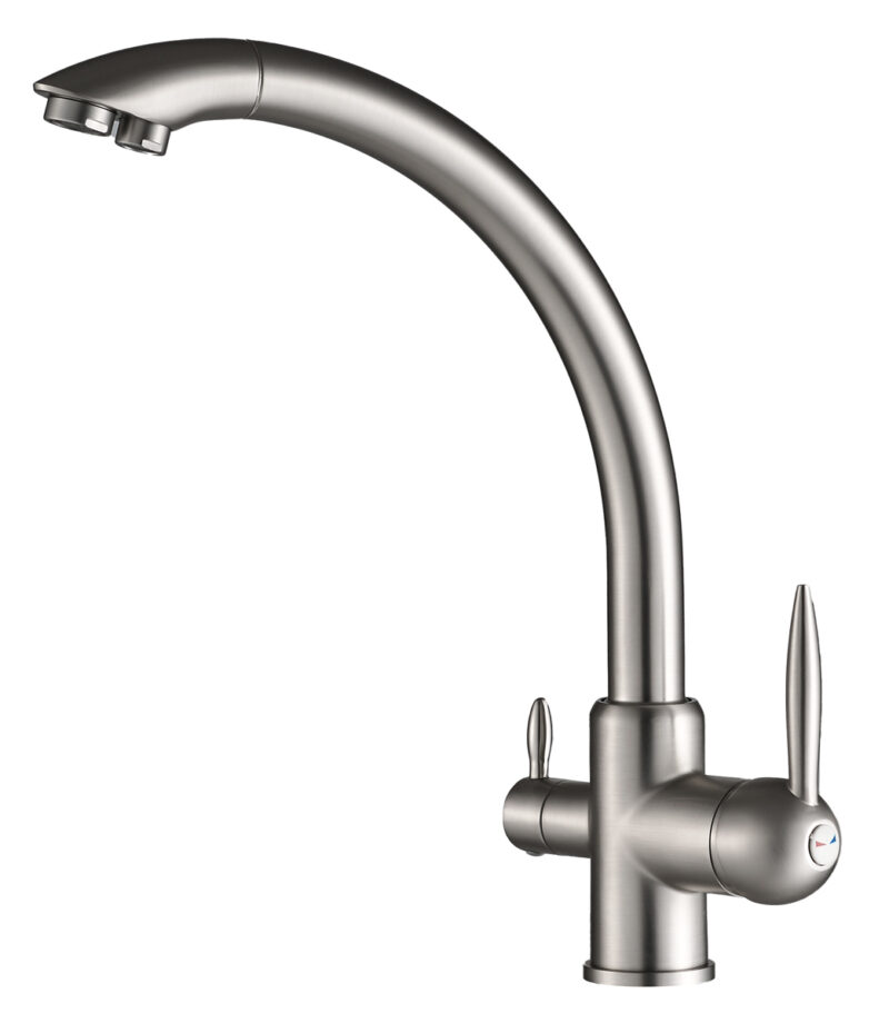 Αυτή η μπαταρία πάγκου κουζίνας διαθέτει τρίοδο σχεδιασμό για τη σύνδεση με φίλτρο νερού και το δίκτυο παροχής ζεστού και κρύου νερού. Έτσι, μπορείτε να απολαμβάνετε καθαρό, φιλτραρισμένο νερό και να επιλέξετε παράλληλα ανάμεσα σε ζεστό και κρύο νερό με τους διακόπτες.