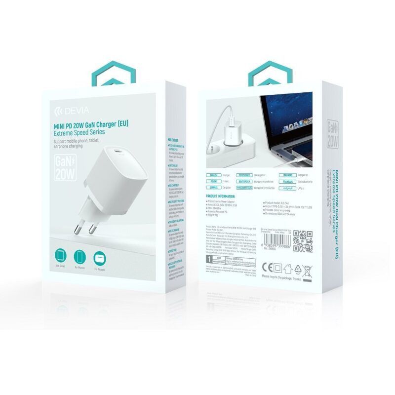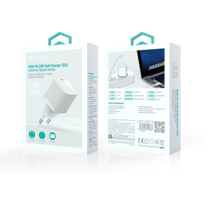 The Devi wall charger is compact with a power of 20 W in GaN technology. Made from durable materials, it is lightweight and sturdy.