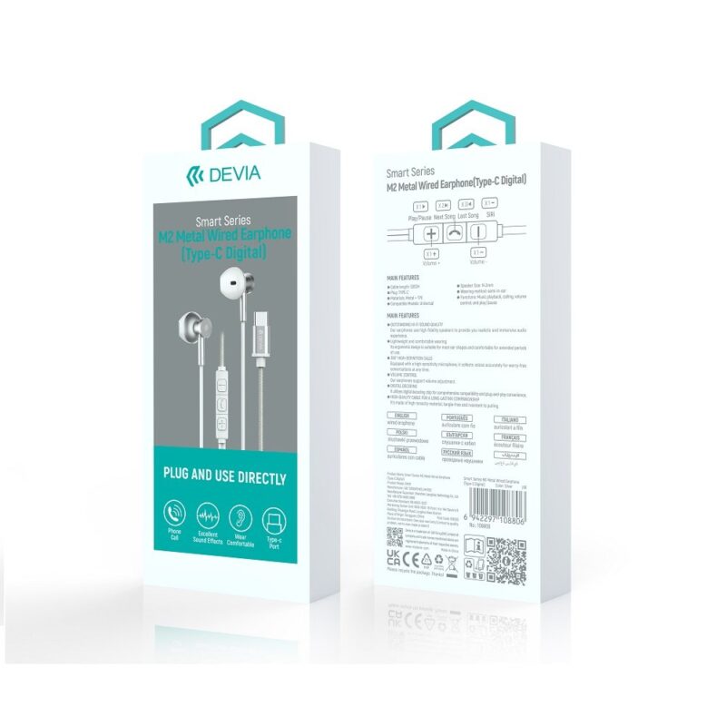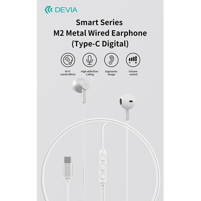Τα ακουστικά Devia Smart M2 Metal είναι ενσύρματα ακουστικά in-ear, συμβατά με συσκευές που διαθέτουν θύρα USB-C και δεν διαθέτουν υποδοχή3,5 mm. Η ποιότητα ήχου Hi-Fi θα ικανοποιήσει τους απαιτητικούς λάτρεις του ήχου που εκτιμούν τις λεπτομέρειες των μουσικών κομματιών.
