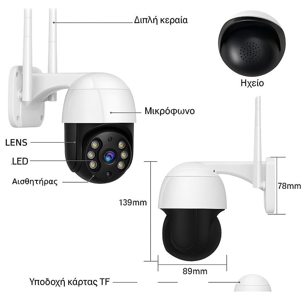 - Νυχτερινή Όραση: Υπέρυθρη + Έγχρωμη με LED, έως 30 μέτρα