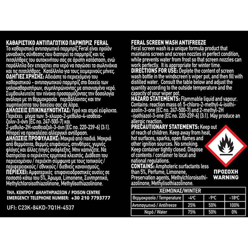 Αδειάστε το περιεχόμενο του καθαριστικού – αντιπαγωτικού παρμπρίζ στο δοχείο των υαλοκαθαριστήρων, συμπληρώνοντας με απιονισμένο νερό. Συμβουλευτείτε τον παρακάτω πίνακα προσαρμόζοντας την δοσολογία ανάλογα με τη θερμοκρασία περιβάλλοντος και την χωρητικότητα του δοχείου σας σε λίτρα.
