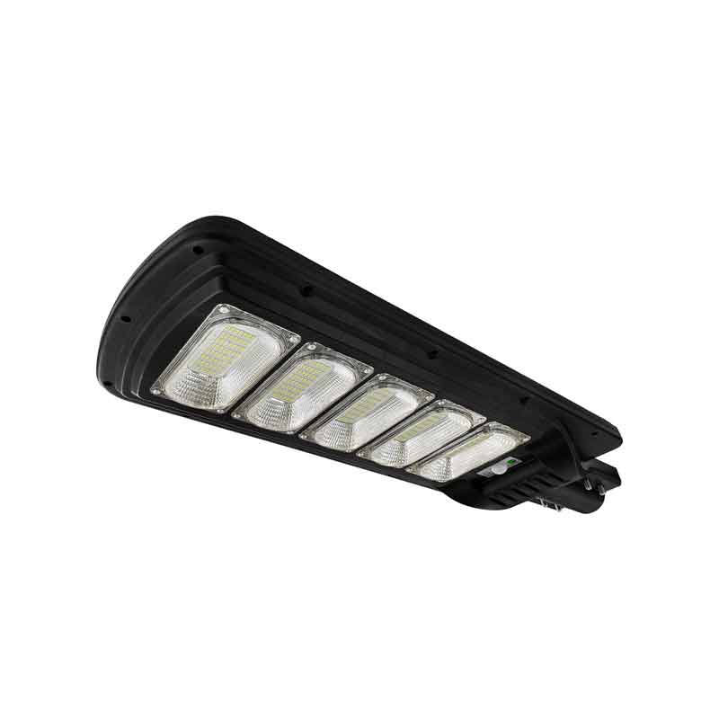 Ηλιακό φωτιστικό δρόμου σε μαύρο χρώμα, που συγκεντρώνει και αποθηκεύει ηλιακή ενέργεια για τη λειτουργία του, ώστε να μη χρειάζεται να συνδεθεί σε παροχή ρεύματος. Διαθέτει ανιχνευτή κίνησης για να ενεργοποιείται όταν εντοπίσει κίνηση εντός της εμβέλειάς του. Περιλαμβάνει τηλεκοντρόλ ώστε να το χειρίζεστε από απόσταση.