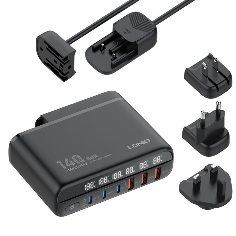 LDNIO σταθμός φόρτισης A6140C, 3x USB-C/3x USB, 140W, PD/QC, GaN, μαύρος