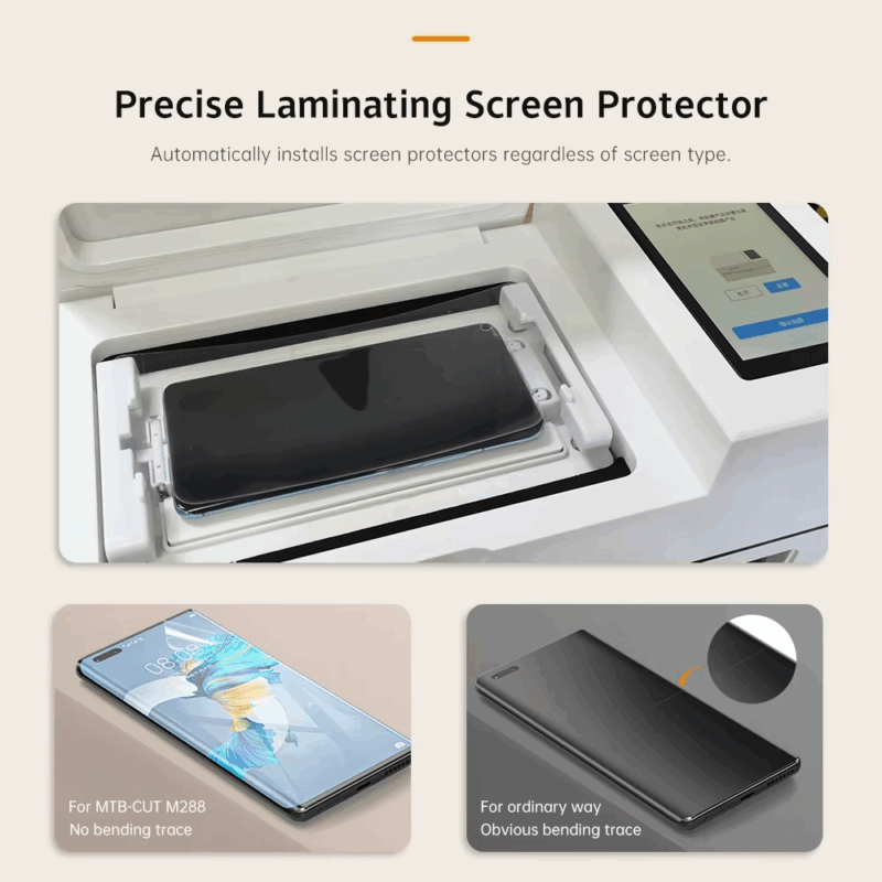 Ως νέα γενιά μηχανημάτων προστασίας οθόνης, το μηχάνημα all-in-one κοπής και πλαστικοποίησης οθόνης MTB-CUT M288 καλύπτει πολλαπλές λειτουργίες χωρίς την ανάγκη για πολλά μηχανήματα και λύνει το πρόβλημα της ευθυγράμμισης του προστατευτικού οθόνης με την οθόνη του κινητού.