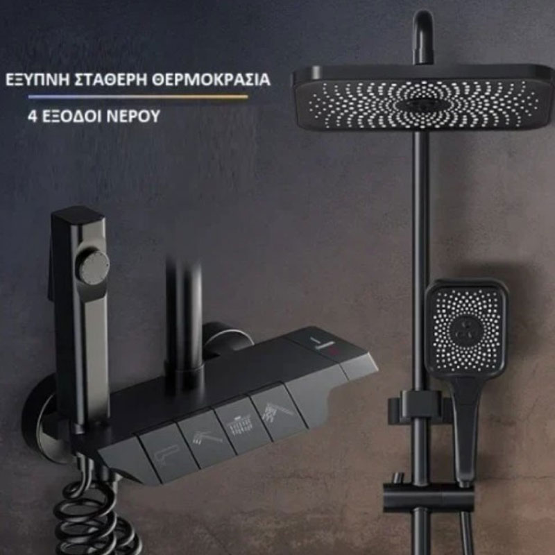 Η ρυθμιζόμενη στήλη ντουζ με μπαταρία και LED οθόνη είναι η ιδανική επιλογή για να απολαμβάνετε καθημερινά ένα άνετο και πολυτελές μπάνιο. Διαθέτει κεφαλή ντουζ βροχής, τηλέφωνο χειρός και πιστόλι ψεκασμού υψηλής πίεσης, προσφέροντας διαφορετικές επιλογές ροής νερού για κάθε ανάγκη.